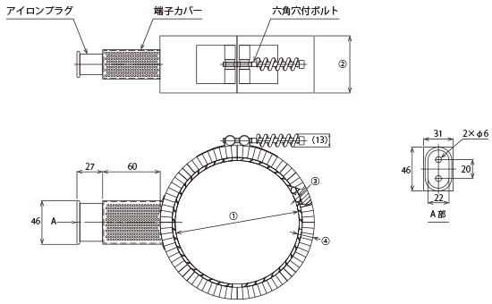 | ①徑(φ) | ②幅(mm) | ③セラミック厚 (mm) | ④カバー厚 (mm) | 最高使用溫度 (℃) | 最大ワット密度 (W/cm2) |