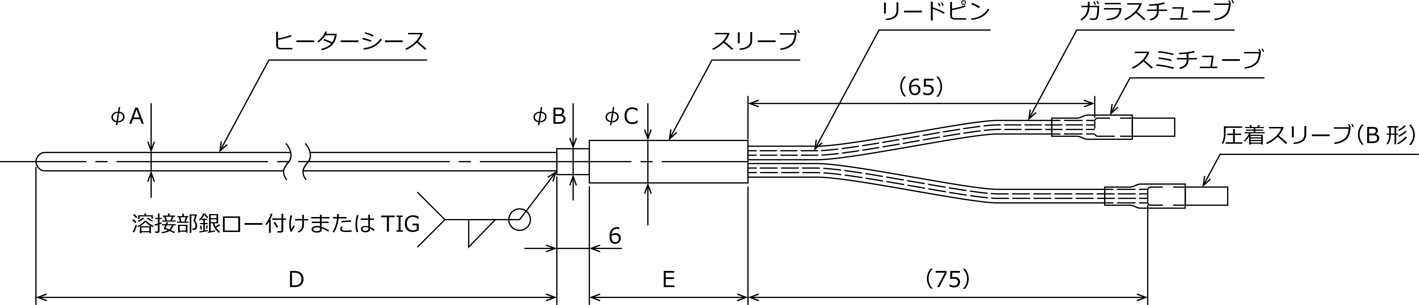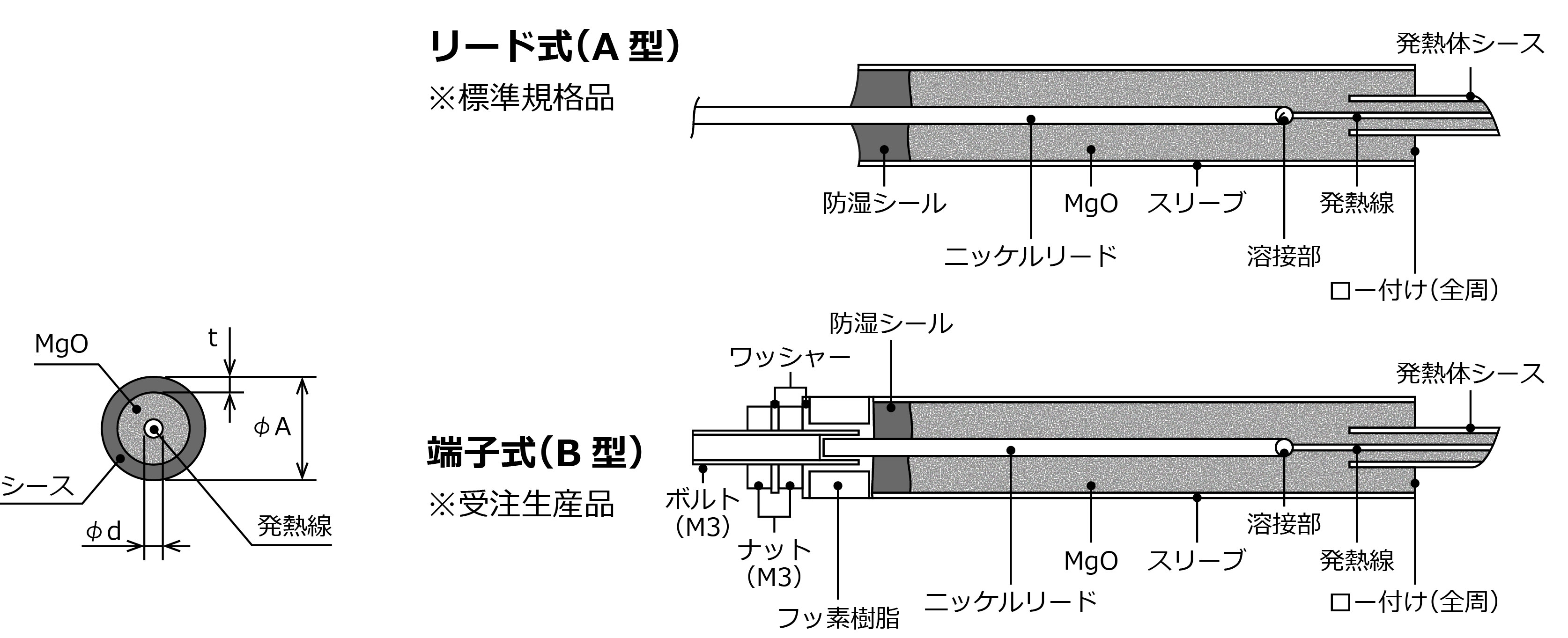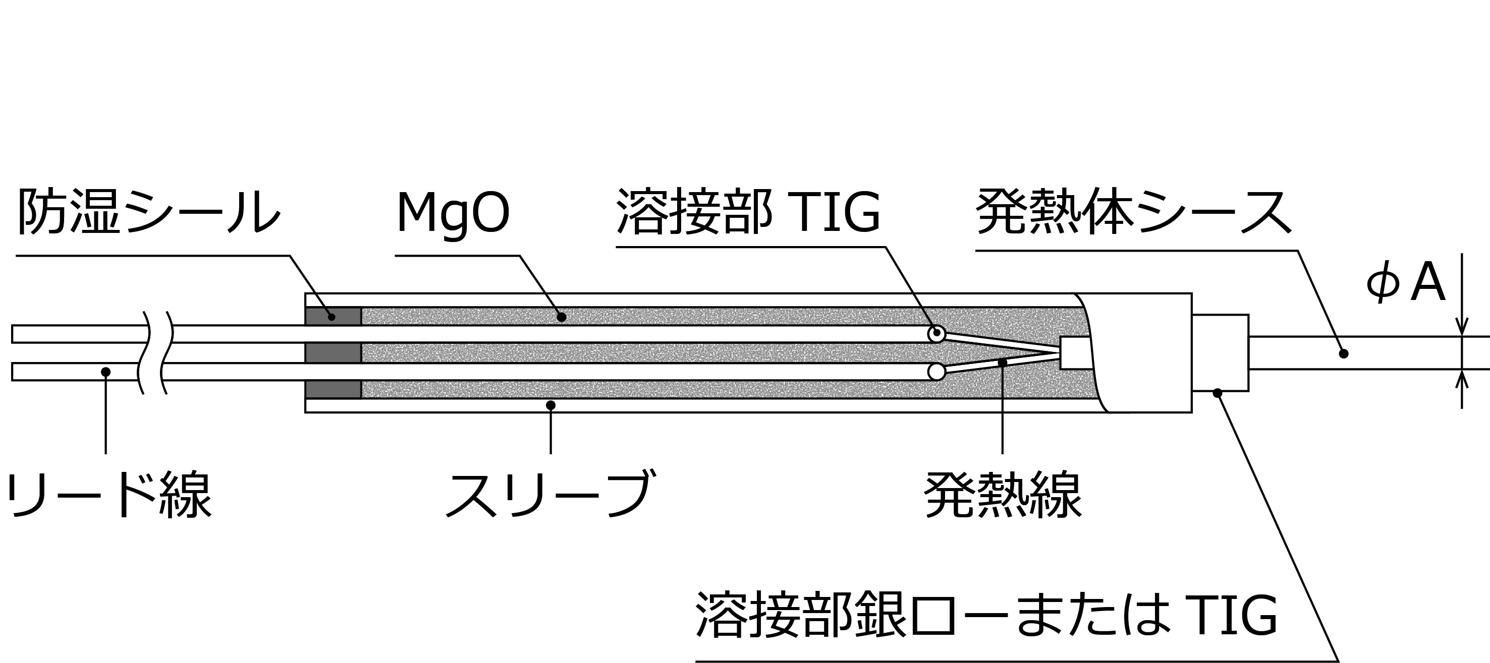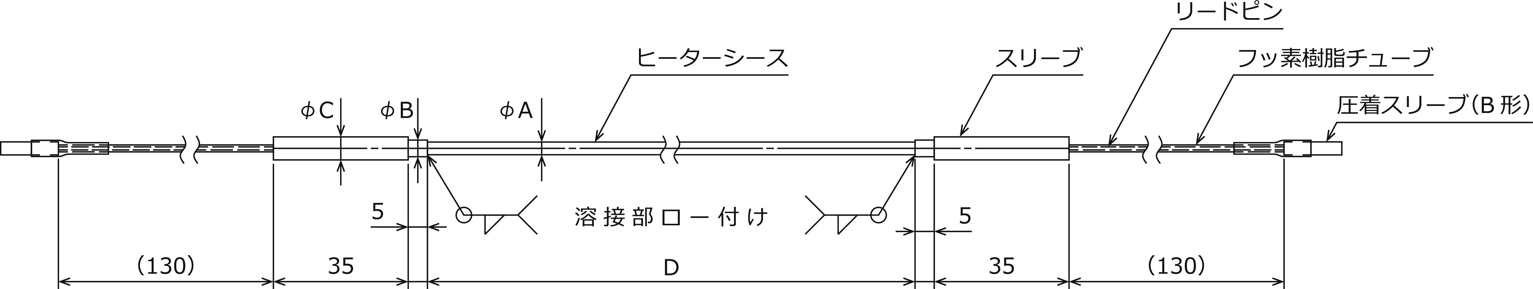 | シース外徑 (ΦA) (mm) | 発熱線徑 (Φd) (mm) | シース肉厚 (t) (mm) | 抵抗値 (Ω/m) | 最大長さ (m) |