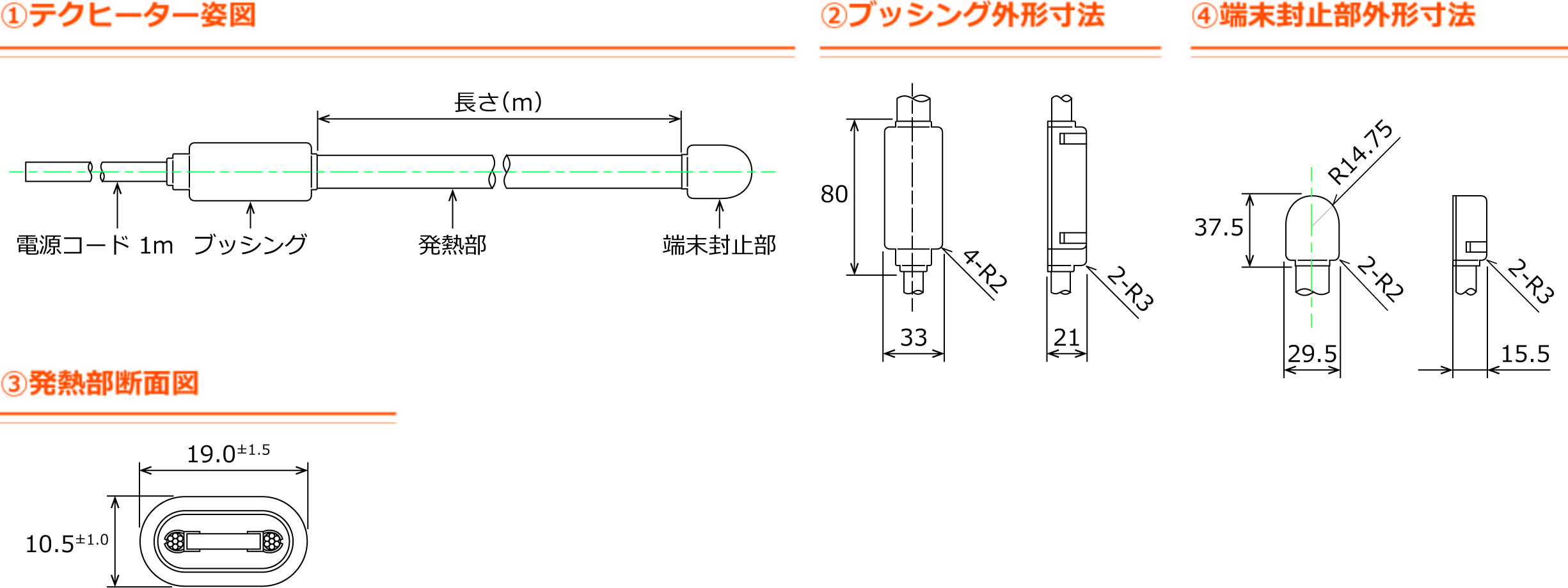 テクヒーターは外裝被覆の損傷防止に特に留意してください。被覆の損傷は、絶縁抵抗値の低下や漏電事故 につながるおそれがあります。メガーチェックで異常が発見された場合は損傷による絶縁不良箇所を除去し、 新しいヒーターに交換をしてください。